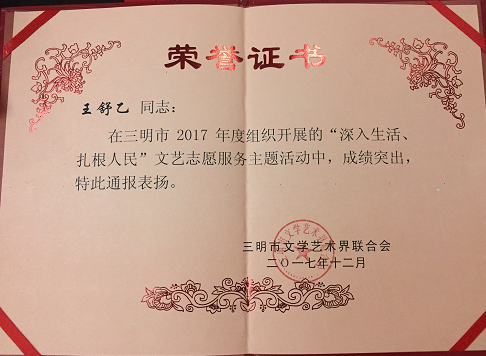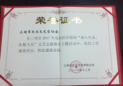 市民協(xié)在三明市2017年度組織開展的“深入生活、扎根人民”文藝志愿服務主題活動中,組織工作成效突出,受到三明市文聯(lián)的通報表揚。其中兩名民協(xié)會員王舒乙、鄭曉芳也被評為2017年三明市優(yōu)秀文藝志愿者。