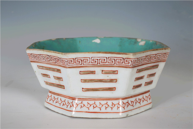 口沿外壁繪有一圈回紋,腹部八面各有一組八卦紋。