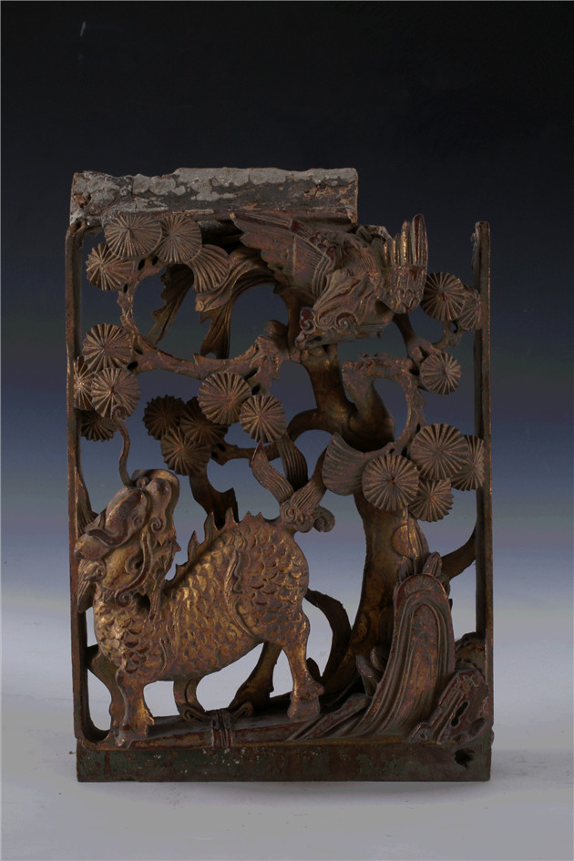 正面委角開光內(nèi)鏤空雕有麒麟、松樹、飛鳥、山石、卷草紋等。
