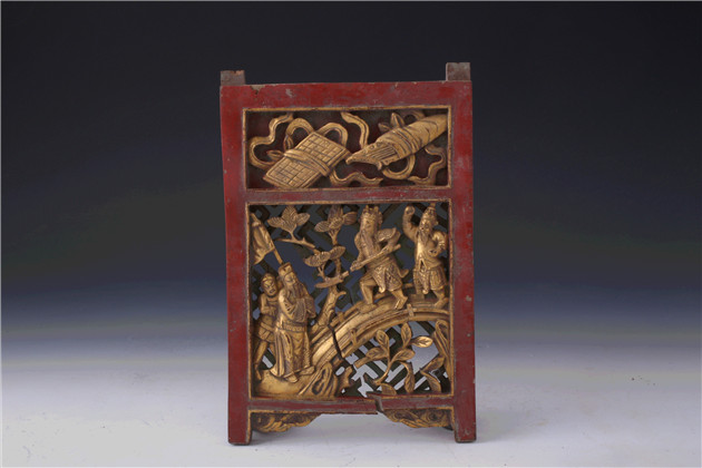 下圖鏤雕“卍”字紋底,其上刻有四個(gè)人物,其中兩人身穿鎧甲,手持兵器。
