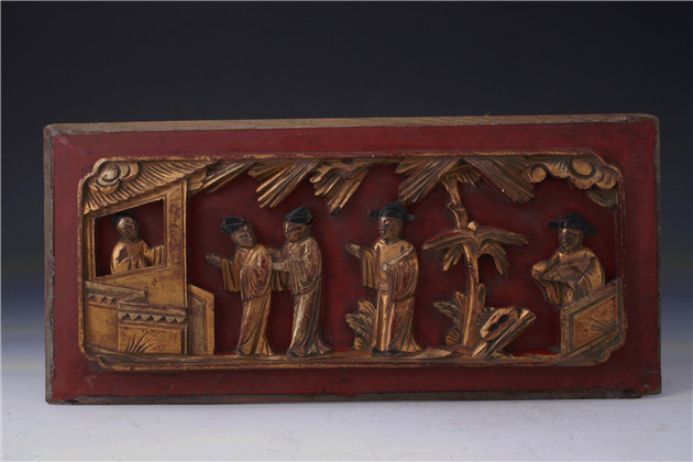 雕工粗糙,朱漆為底紋,人物漆金,金彩局部脫落。