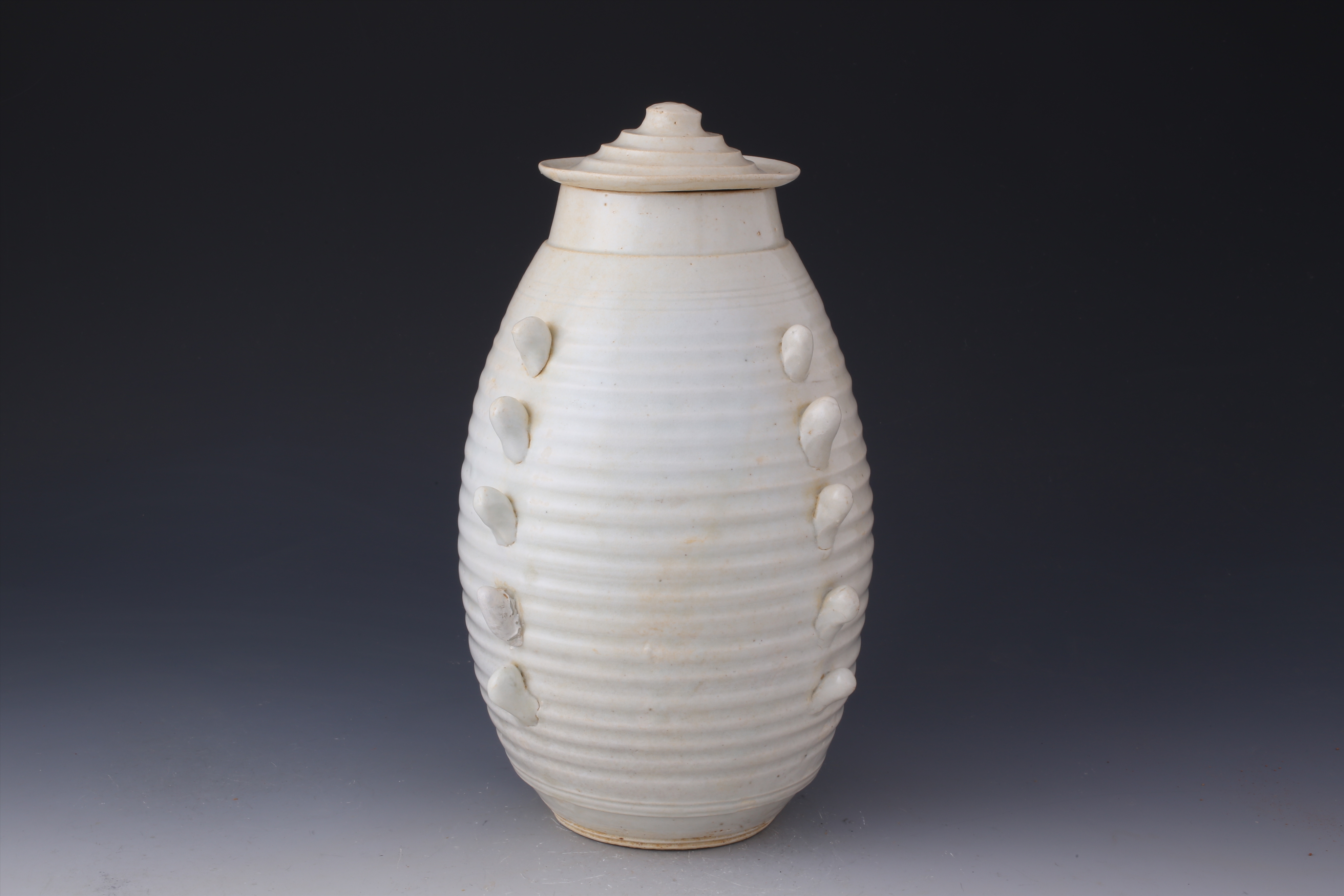 直口,短頸,溜肩,長弧腹,平底內(nèi)凹。帶蓋,笠形狀,圓鈕。帽面三階式,帽檐上翹。器身有數(shù)道弦紋,對稱置有四列錐狀點,每列五個。外壁施白釉,內(nèi)壁及底無釉。胎白質細,器型規(guī)整。