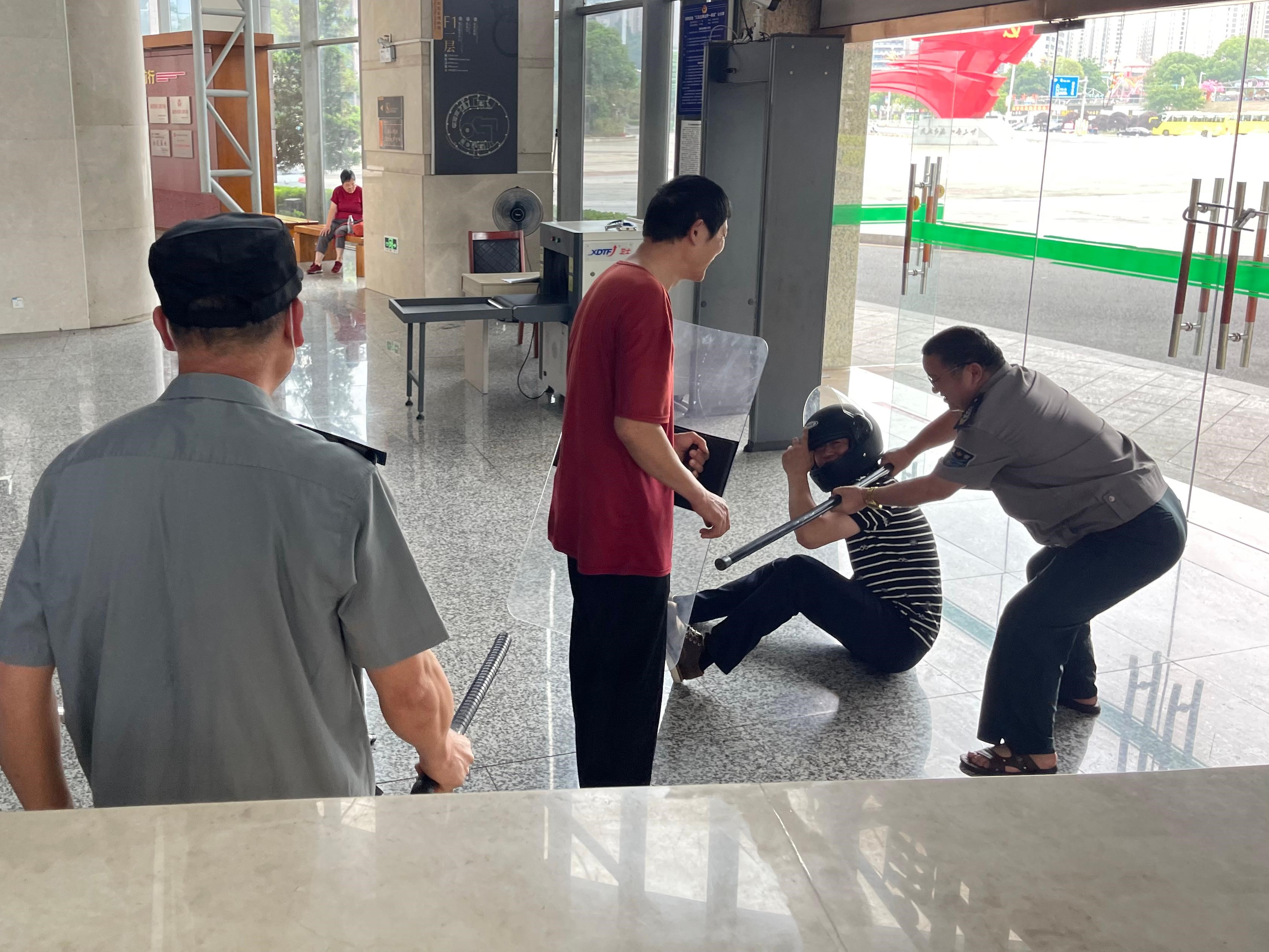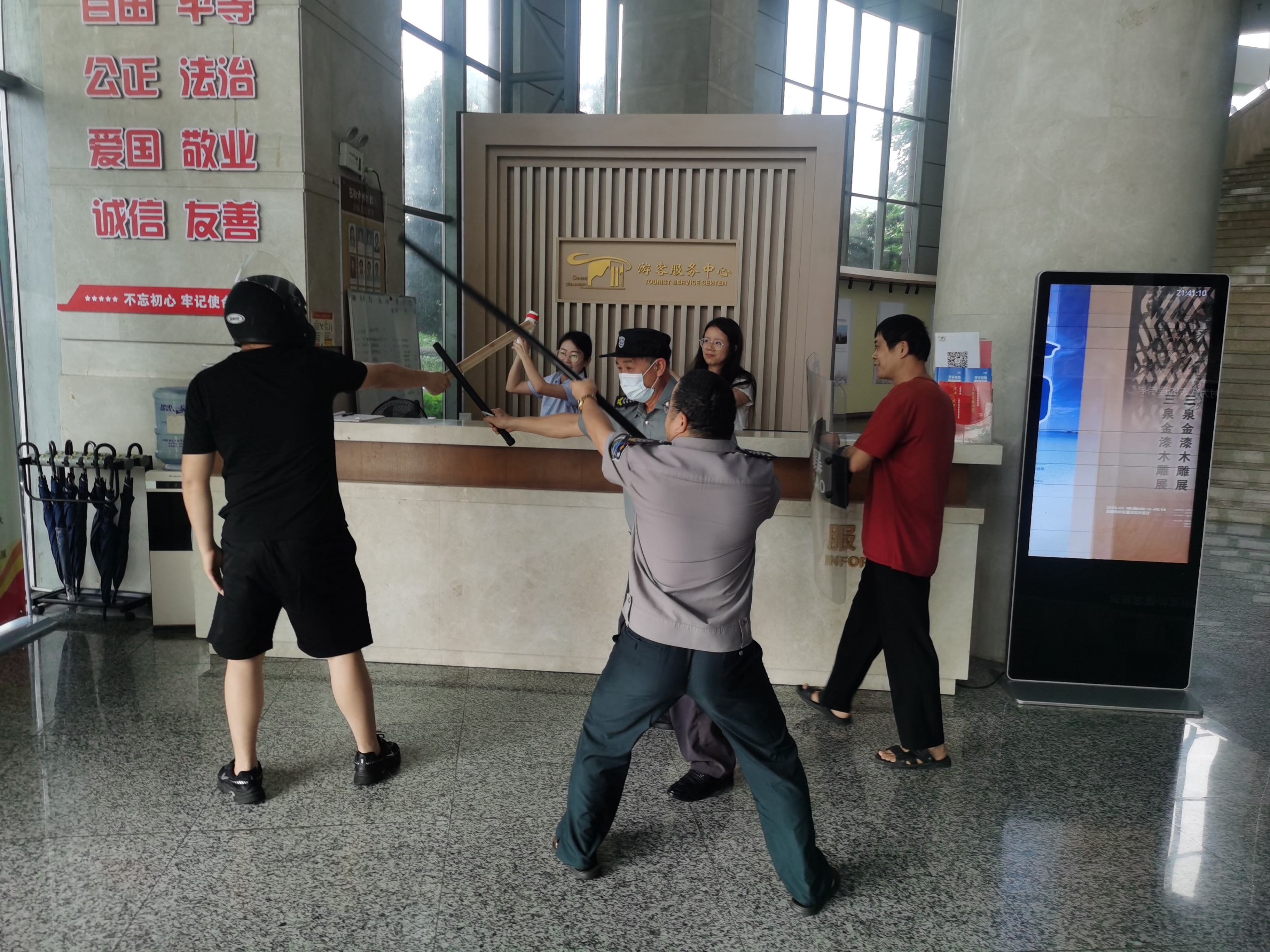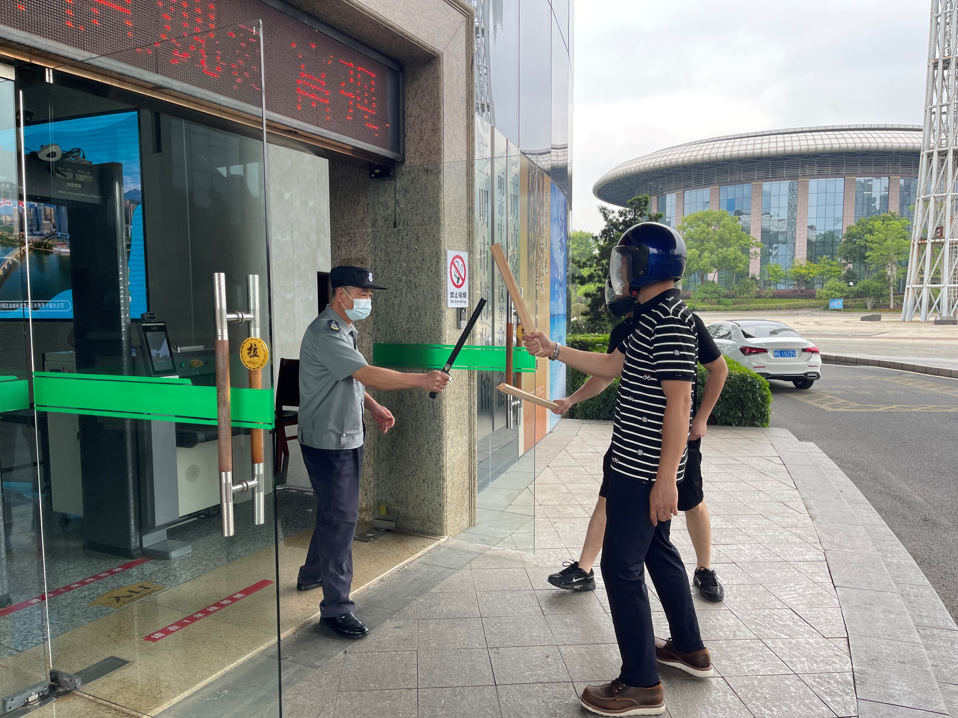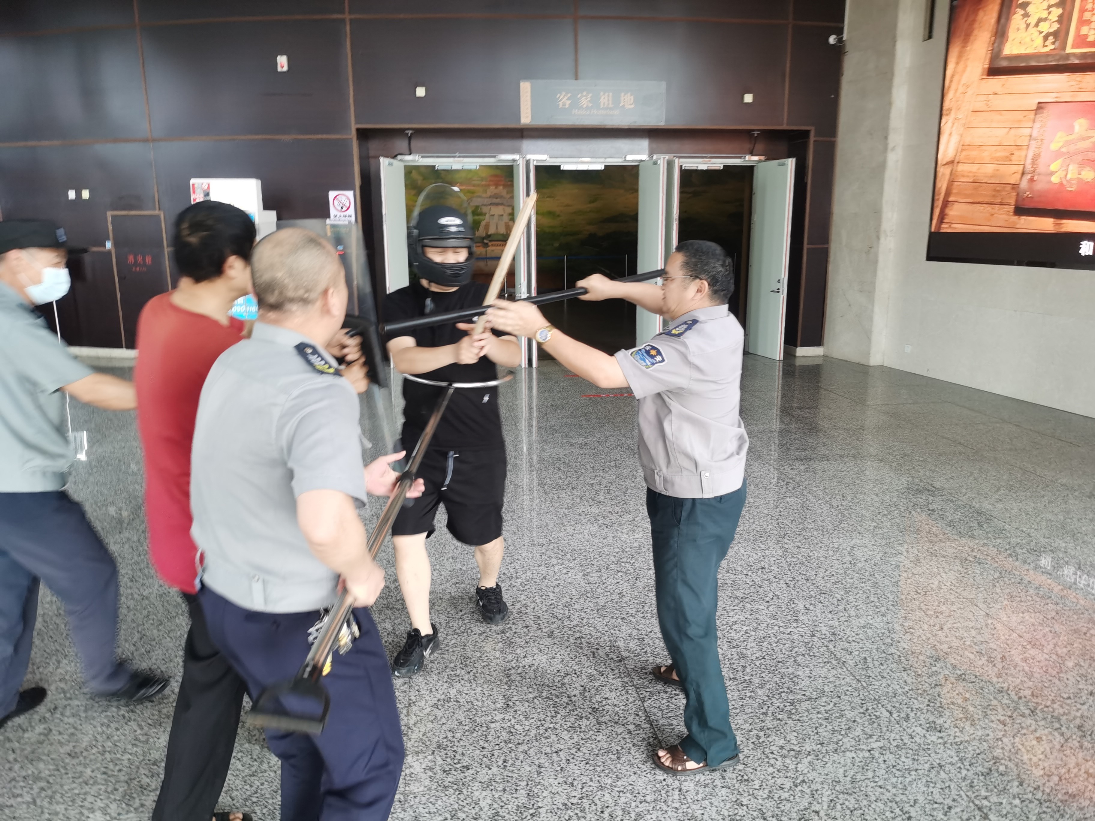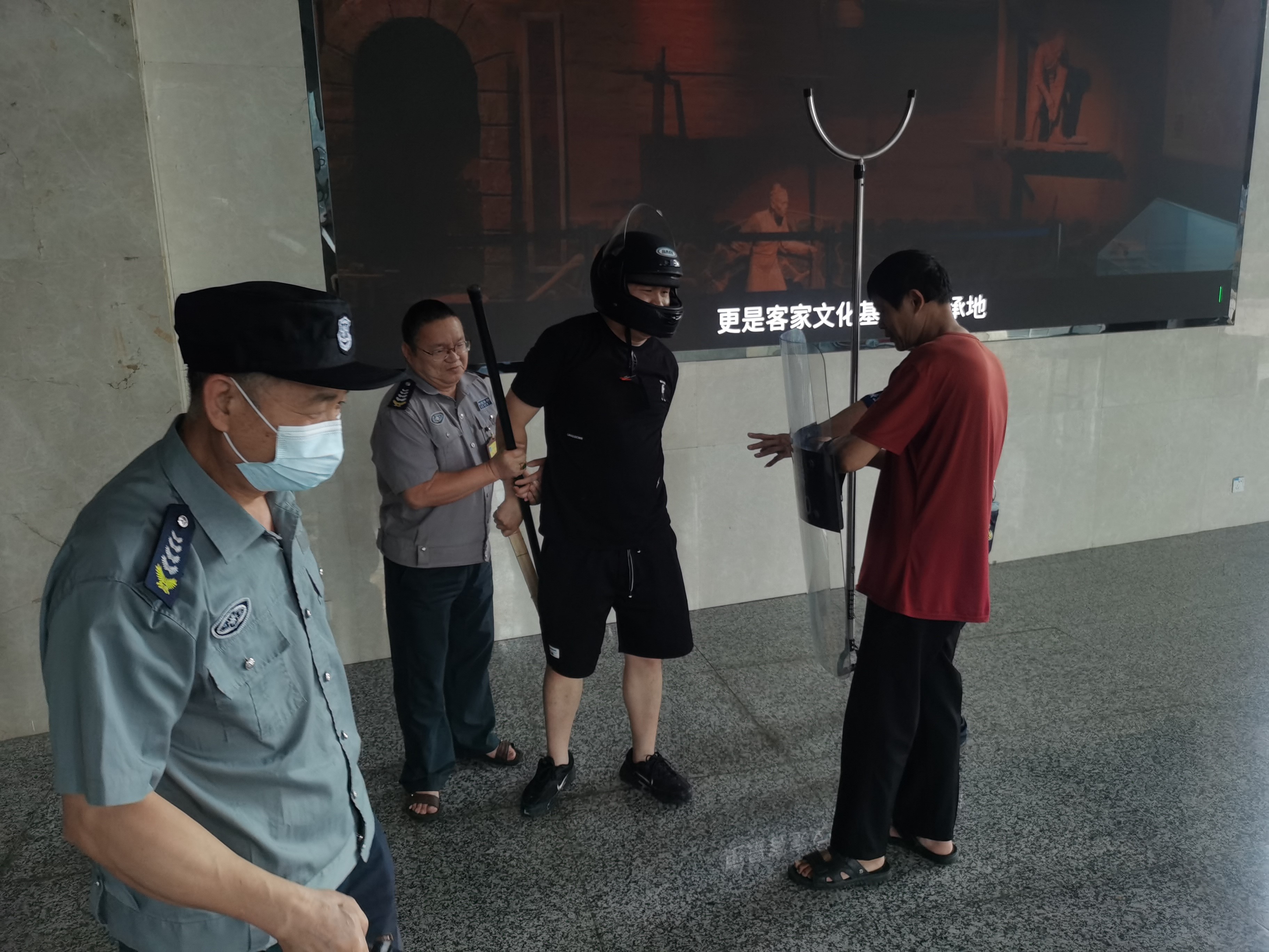 演練第一場景:模擬2名“暴徒”手持木棍,從城市文化廣場方向,企圖闖入博物館進行破壞。當(dāng)“暴徒”強行闖入時,博物館安保人員迅速反應(yīng),立即啟動應(yīng)急預(yù)案,利用防爆器械與“暴徒”展開周旋。安保人員密切合作,最終成功在博物館外制服了“暴徒”。