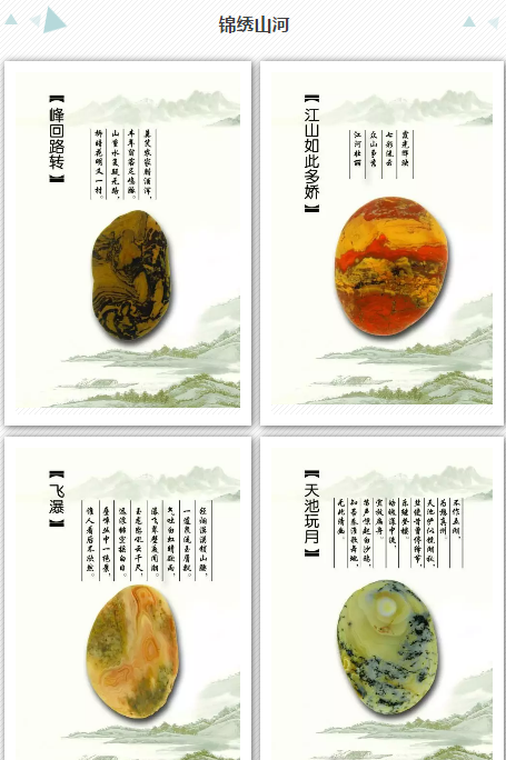 中國地大物博,山川秀麗,北有白山黑水,南有浩瀚大海,西有名川大山,東有廣袤平原。這一組光彩熠熠的小石,縮影了大川江河,以山巒起伏、云遮霧掩、亭臺樓閣、日月星辰等濃墨重彩的壯色景觀,展示了祖國山河美不勝收的風光。