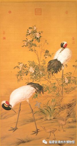 設(shè)色絹本,縱121.7厘米、橫66.3厘米。郎世寧(1688—1766)意大利人,原名朱塞佩·伽斯底里奧內(nèi),生于米蘭,清康熙帝五十四年(1715)作為天主教耶穌會(huì)的修道士來中國傳教,隨即入宮進(jìn)入如意館,成為宮廷畫家,曾參加圓明園西洋樓的設(shè)計(jì)工作,歷任康、雍、乾三朝,在中國從事繪畫達(dá)50多年。《花陰雙鶴圖》深受康熙、雍正、乾隆三代皇帝的欣賞,畫面色彩艷麗,設(shè)色以朱紅,石綠,石黃、蛤粉等,畫中四鶴像是一個(gè)優(yōu)雅溫馨的家庭,畫面雅而不俗,足見郎世寧技藝超群。